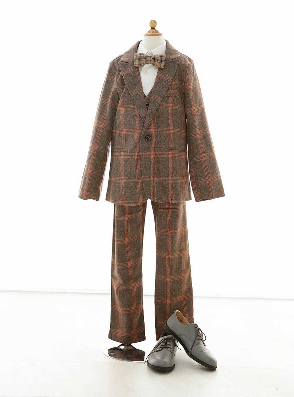 クラシックでありながらモダンな要素を取り入れたタキシードです。ブラウンを基調としたチェック柄のジャケットとパンツは、どこか懐かしさを感じさせながらも現代的なシルエットで洗練された印象を与えます。 全体的に同系色でまとめられ、統一感のあるタキシードの為、兄弟撮影や家族撮影時にも統一感を出しやすい一着です。