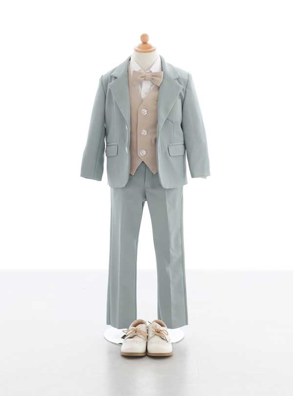 グレーと水色が混ざったような淡いカラーのジャケットとパンツがセットの1着。ジャケットの下にはベージュのベストと同色の蝶ネクタイがセットされており、全体的にエレガントでクラシックな印象を与えます。 シャツは白で清潔感があり、ベストの色とバランスをとっています。色合いとデザインがシンプルなため、鮮やかな背景がよく映えます。