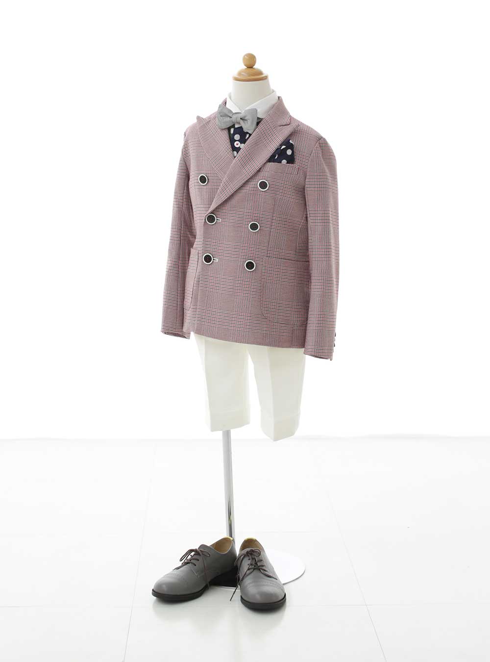 赤のギンガムチェック柄でダブルのジャケットがしっかり決まって、大人っぽく、白のハーフパンツで可愛らしさもありオシャレに見せてくれます。 遊び心のあるドットのシャツと同じ柄のポケットチーフがアクセントになっていて、可愛さもアップ♪特別な日やイベントで、いつもとは違う格好良さを演出できる1着です。