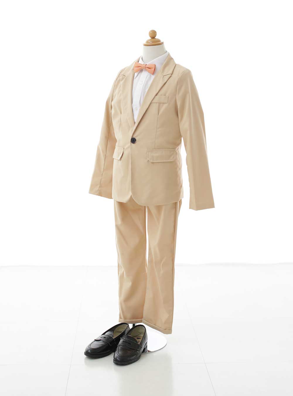 優しいベージュの色合いがとってもオシャレな印象を与え、オレンジの蝶ネクタイが子どもらしい可愛さをも引き立ててくれます。 全体的に明るい色味で優しい印象をも与え、ジャケットスタイルは大人顔負けのスタイリッシュさで、写真映え間違いなしの1着です。普段とは違う、ちょっと背伸びしたい日にもぴったりです。