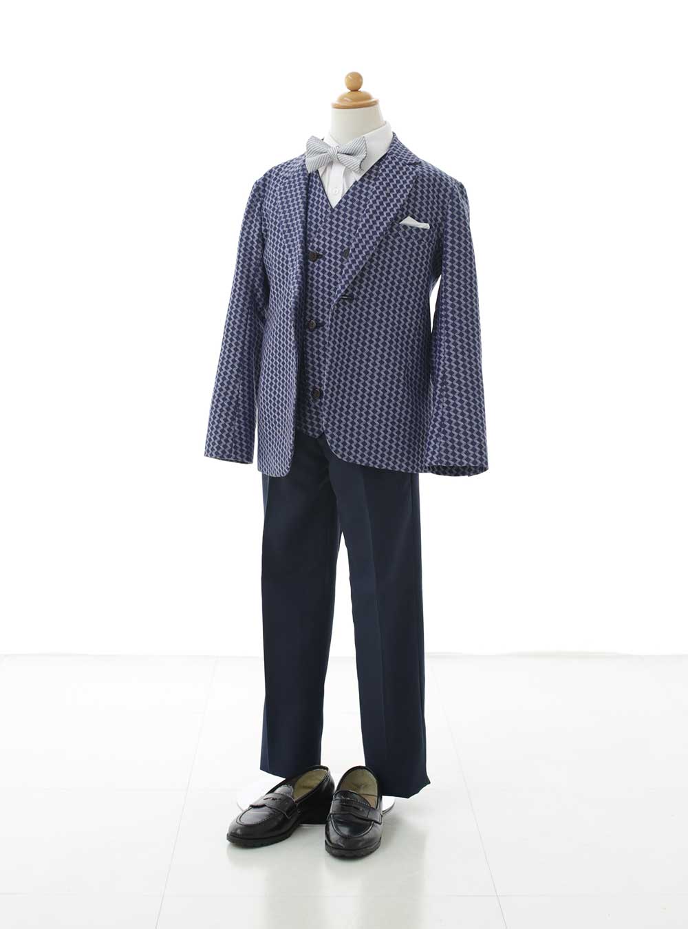 ネイビーを基調としたスーツになっていて、ジャケットとベストには独特な柄が施されています。細かい模様が繊細に組み合わさることで、おしゃれな印象を与えるとともに、上品で今っぽい雰囲気を出しています。 シャツと淡いグレーの蝶ネクタイがスーツの柄を引き立て、全体を引き締めるアクセントとなっています。