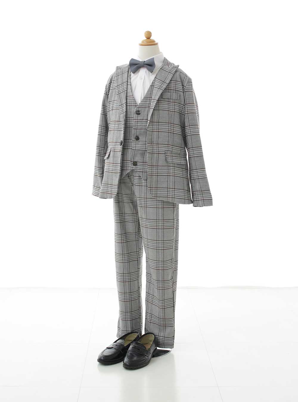 グレーを基調としたチェック柄が特徴的で、ジャケット・ベスト・パンツが同じチェックパターンで統一されていて、英国風のスタイリッシュなデザインになっています。 シャツはシンプルな白で、淡いグレーの蝶ネクタイがアクセントとなり全体のコーディネートを引き締めています。黒色のローファーと合わすことでよりお洒落な印象にしてくれます。