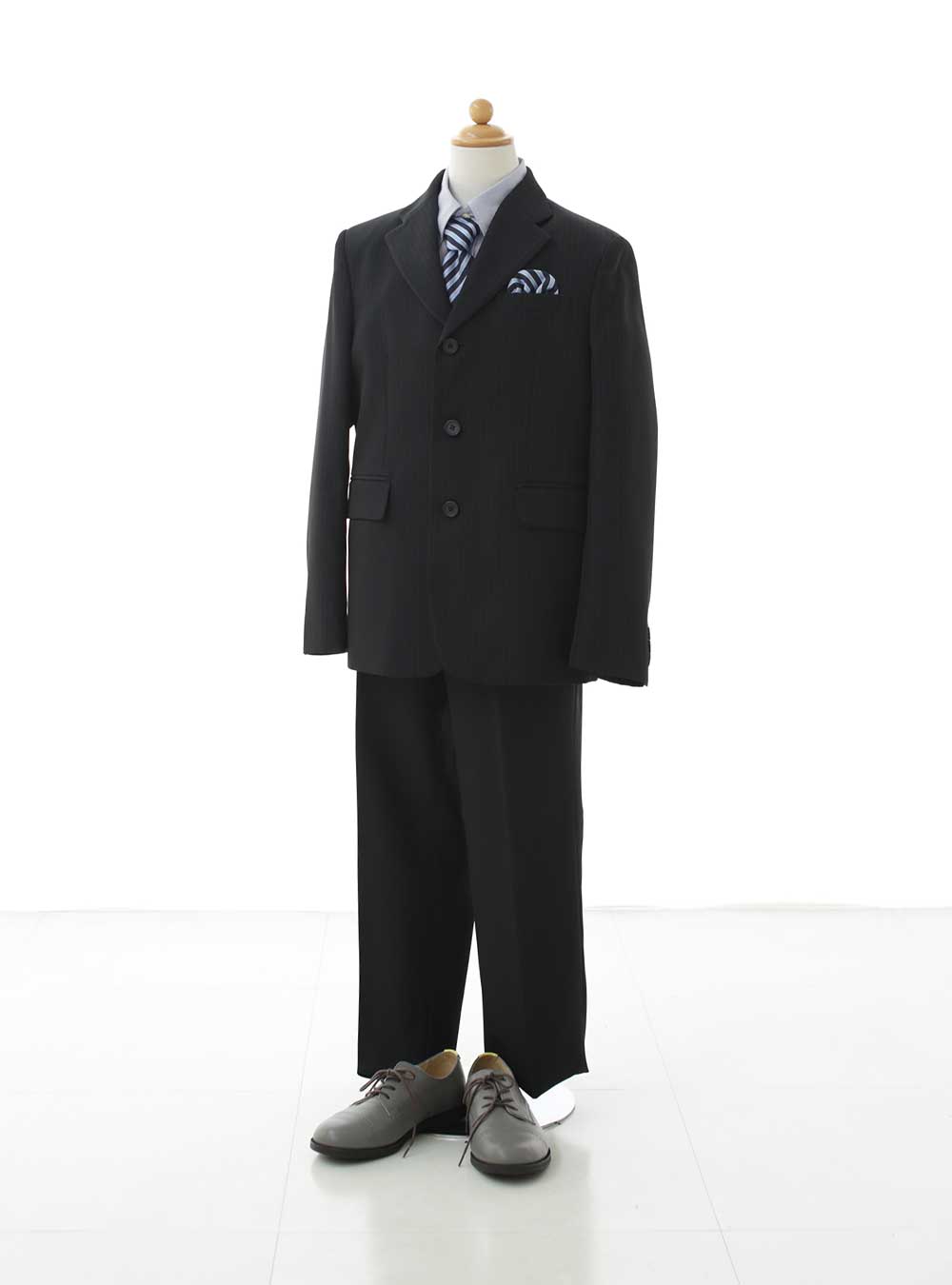 ブラックを基調としたフォーマルなデザインの2ピーススーツ。ジャケットはシンプルながらも、ストライプ柄のポケットチーフとネクタイがアクセントとして効いています。 ポケットのデザインも控えめで、クラシカルで落ち着いたスーツなので他の衣装より大人っぽい印象になります!シンプルなデザインなのでどの雰囲気のお子様にも似合う1着です。