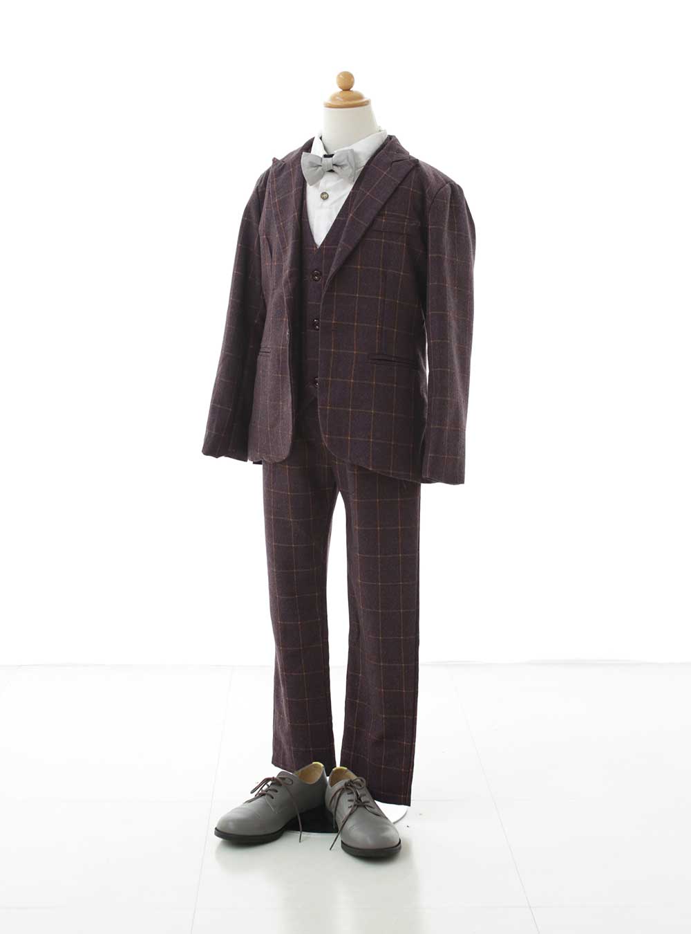 赤系のブラウンを基調としたチェック柄の3ピーススーツ。柔らかい生地感とチェック柄の細やかなラインがシックでありながらもオシャレな1着です。ベストも同じデザインで統一されており大人っぽい雰囲気ですが、グレーの蝶ネクタイが可愛らしいイメージを与え大人過ぎない印象になります。 全体の色味が濃いので落ち着いた背景での撮影や外の背景にも似合います!