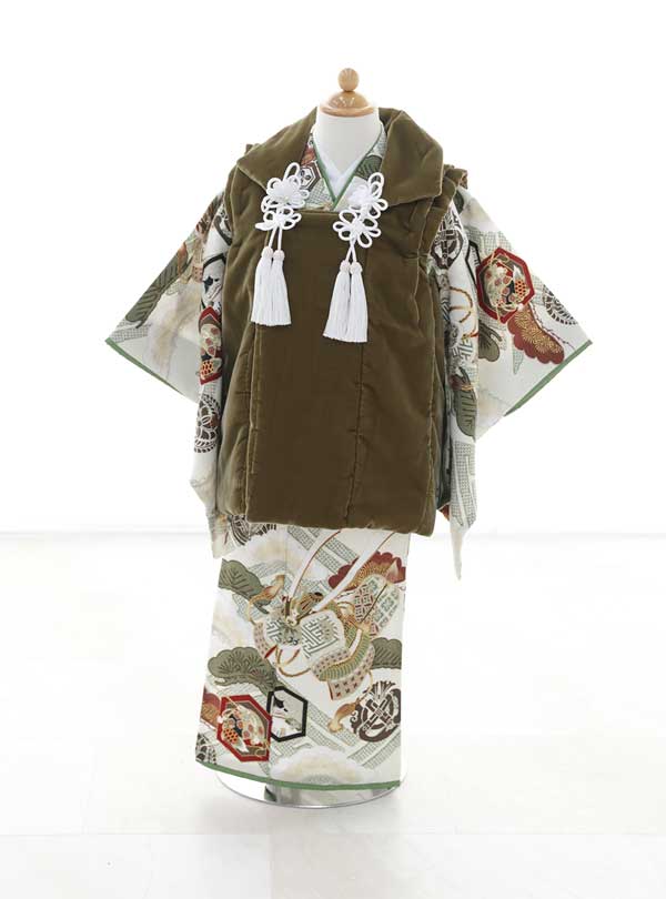 上品で落ち着いたグリーンの色味でまとめられた着物には、兜や松などのおめでたい文様が描かれています。被布は深い黄みの抹茶色で、コーデュロイ調の起毛した生地で高級感があり、被布飾りの白のつまみに房飾りがポイントになっています。 被布タイプなので簡単に着付けられます。大切な晴れの日にピッタリの古典的で正統派な装いです。