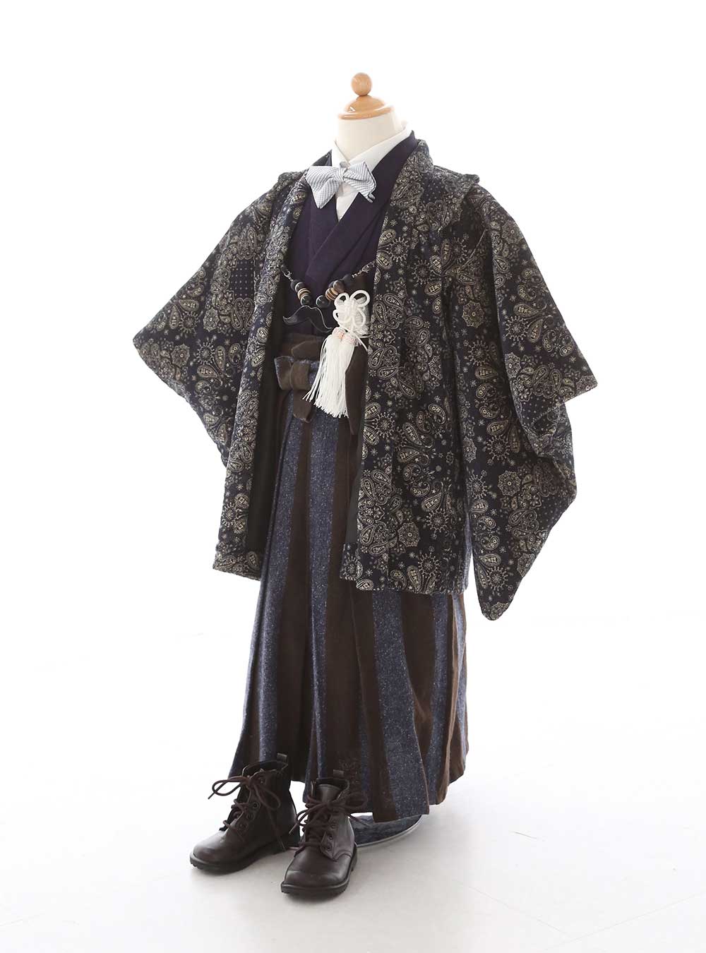 紺色を基調としたタキシード生地で作られた個性的な1着。従来の襦袢を合わせるのではなくシャツに蝶ネクタイをつけて着物を着るスタイルです。 羽織は着物ではとても珍しいペイズリー柄で、さらに羽織紐はおひげの形になっており細部までこだわった遊び心があるデザインです。ハットやブーツを合わせたスタイルがおすすめ。