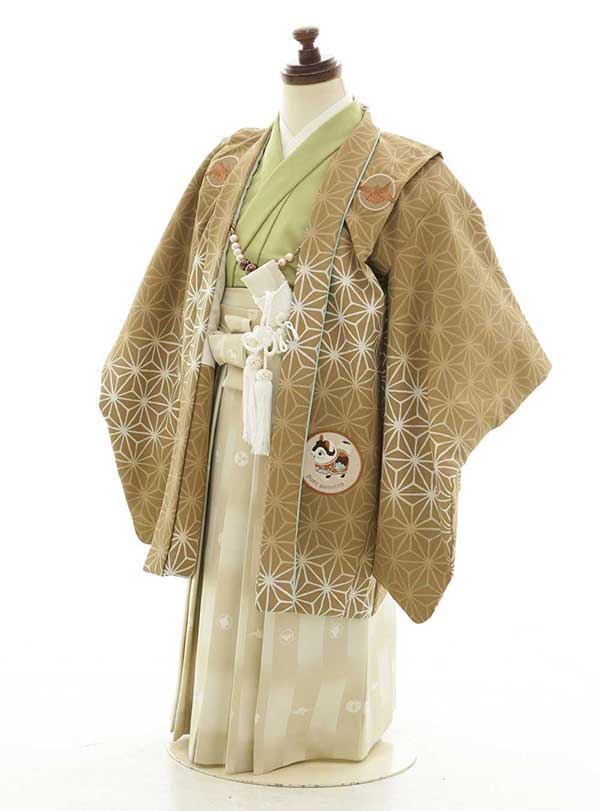 羽織は落ち着いた色のブラウンの羽織で春らしい優しい雰囲気です。全体的に細かい菱形模様が織り込まれており、上品な印象です。袴は羽織よりも少し明るめのクリーム色で、羽織の色と相性抜群です。 全体的に落ち着いた雰囲気ですが、動物の刺繍など、可愛いらしい要素を取り入れており大人の落ち着いた雰囲気と子供らしさどちらも兼ね備えた1着です。