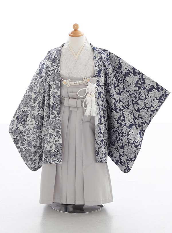 デニム生地の高級感のあるシンプルで上品な色合いが特徴の羽織袴。中の着物は白、袴部分は淡いグレーで色味が統一され、全体的に落ち着いた印象を与えます。 羽織には落ち着いた紺色と白の葉の模様があしらわれていて、左右で少し色味が違うのもポイント!パパ・ママ・3歳男女・5歳男児・7歳女児にもお揃いのデザイン着物があるので、お揃いで家族撮影ができます。