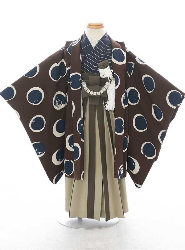 茶色の地色の羽織に紺色の丸模様が可愛らしい個性的なモダン柄の着物です。白で縁どりされた丸模様は版画調で目を引きます。 着物は左右幅の違う縞模様になっており羽織の丸模様と組み合わせることでモダンな印象に。袴はツートーンタイプになっているのもポイントで、お子様が歩いたり動いたりすることでベージュカラーが見える遊び心のあるデザインです。ベレー帽やストール、ブーツとも相性抜群。