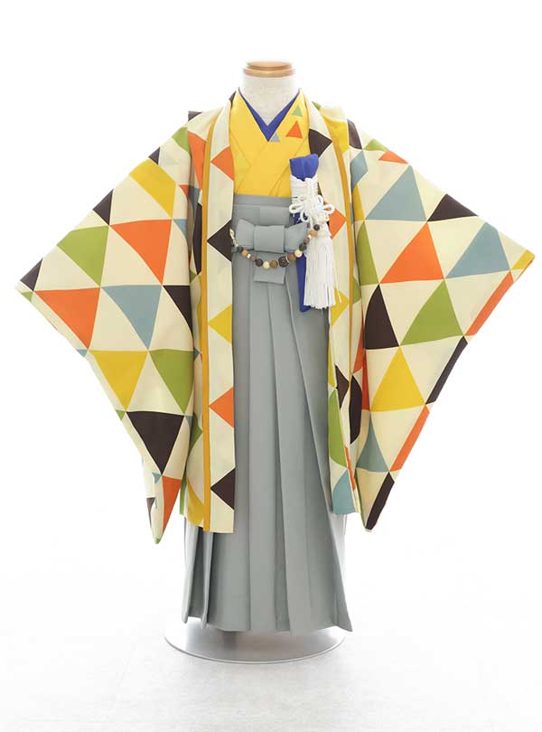 羽織は色鮮やかな三角模様は視覚的にインパクトがあり、モダンな印象を与えます。黄色の着物と羽織の絶妙なバランスの色合いが調和しており、現代的なコーディネートが際立っています。 襦袢と懐剣が鮮やかな青色を使用することで、アクセントになり、個性を引き立てつつ日本の伝統美を感じさせる1着。シンプルな背景がよく映えます。