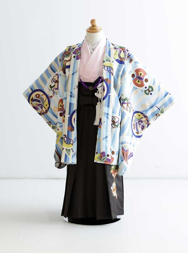 伝統的な和の美しさとカラフルなデザインが調和した一枚です。羽織は明るいブルーを基調としカラフルで楽しい模様が施されています。着物は柔らかなピンク色で羽織と美しく調和しており、全体に温かみと優しさを感じさせます。 袴は落ち着いた黒色で羽織のカラフルな色使いを引き立てます。シンプルながらも上品な印象を与え、全体のコーディネートが洗練されたスタイルにまとめられています。