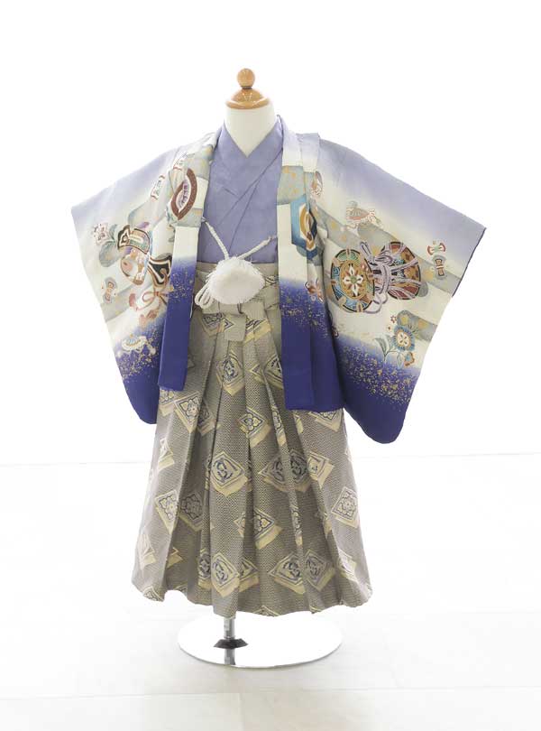 着物全体を覆う紫の色が上品で華やかな印象を与えます。紫は高貴な色とされお祝い事にもふさわしい色です。着物全体に描かれた古典柄は、松や鶴など縁起の良いものが多く、男の子の成長を祝う意味が込められています。 着物の一部に金彩が施されおり、豪華さを演出しています。柄の細やかさと紫の深みが、伝統的でありながら存在感ある装いを演出します。