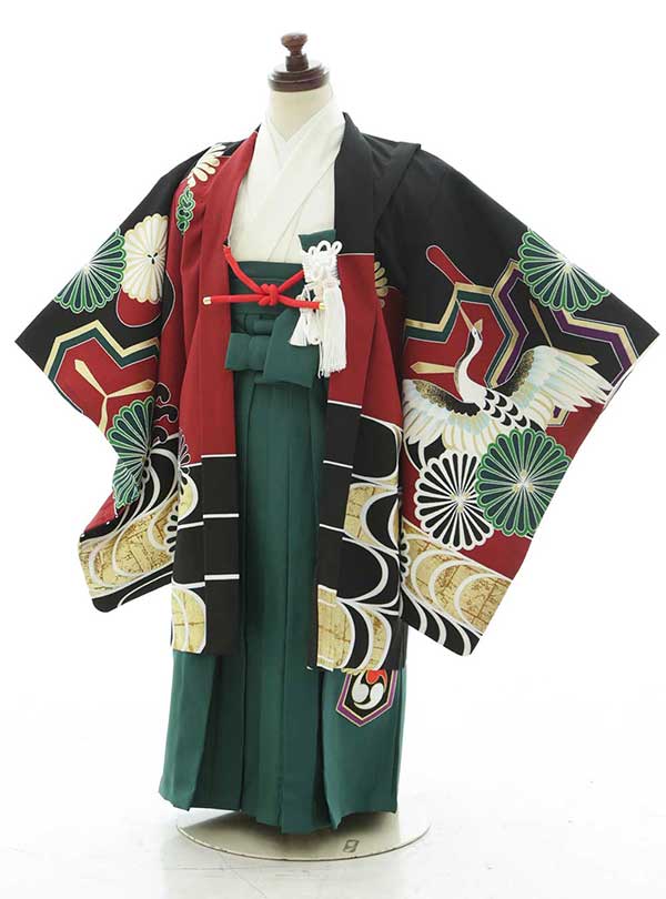 深い緑色の袴に、黒を基調とした羽織と、白の着物を組み合わせたモダンなスタイルの着物です。羽織には赤と金色のアクセントがあり、松や扇や鶴などのおめでたい模様が描かれています。 デザインは豪華で、目を引く色使いが特徴的です。