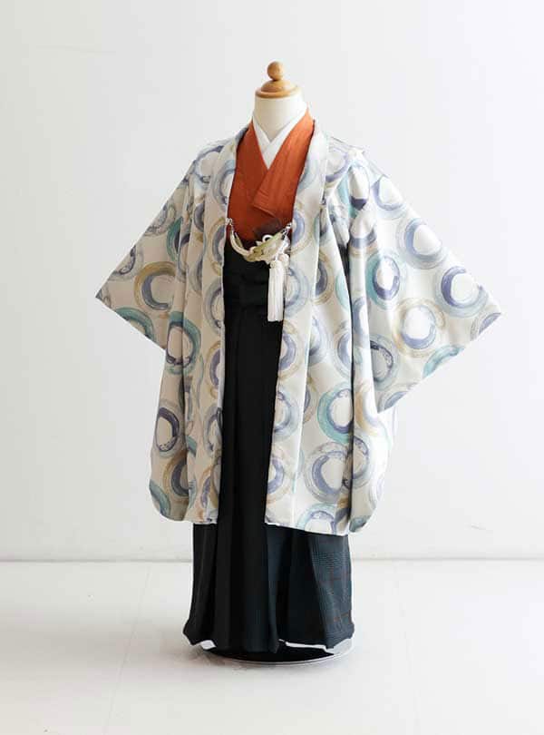 現代的なセンスと伝統美が融合した目を引く一枚です。柔らかなブルートーンを基にした羽織には円形のデザインが規則的に配置され、幾何学的な美しさを表現しています。このユニークなパターンはまるでアート作品のように視覚的なインパクトを与え、個性を引き立てるデザインです。 シックなグリーンの袴が合わせられており、このコントラストが全体の印象を引き締めます。