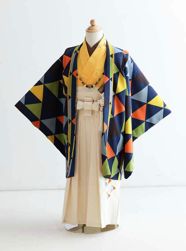 三角の形をしたカラフルな柄が可愛らしいポップで個性的なデザインです。 襦袢と懐剣の茶色がアクセントになり、着物全体を引き締めたコーディネートになっています。 自分らしいオシャレを楽しみながら、華やかで色鮮やかな装いをしていただける着物です。 可愛い色の組み合わせが元気いっぱい!五歳の活発で明るい男の子にピッタリです。