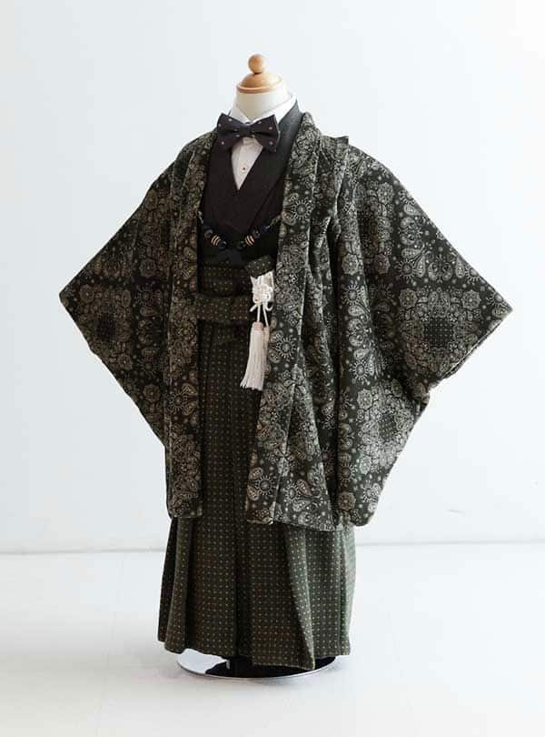 和の伝統を現代的なセンスで再解釈したスタイリッシュでユニークな一枚です。深いグリーンを基調とした羽織は繊細なペイズリー模様が施されており、目を楽しませる美しいデザインです。ドット模様の袴が重ねられており、全体のコーディネートに深みとリズムを加えています。 伝統的な美しさを保ちながら、現代的な装いを楽しめる要素を持っています。