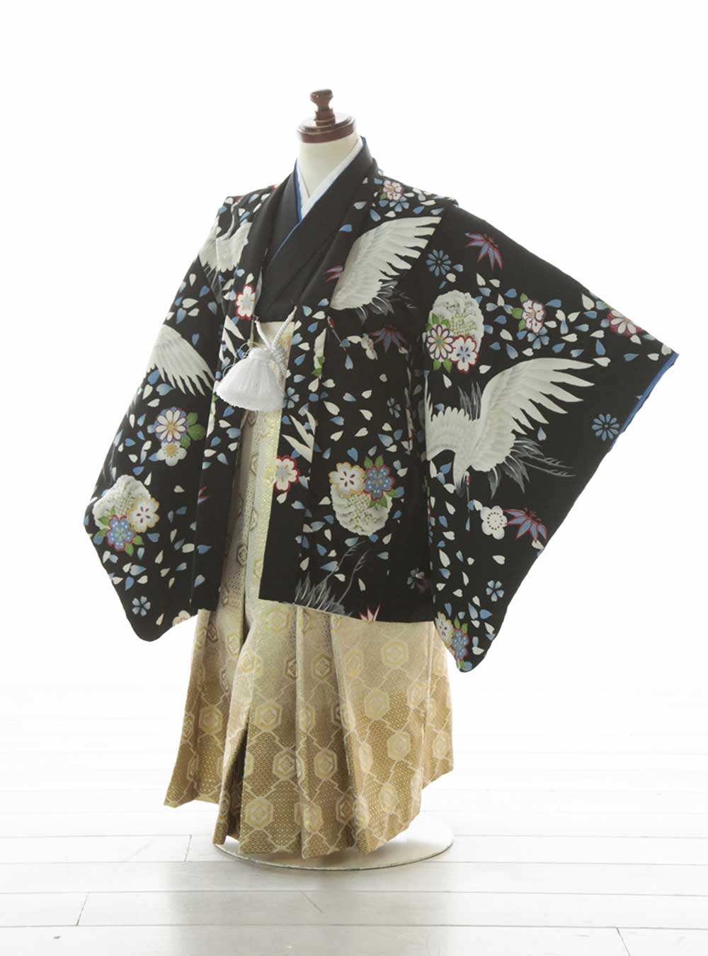 大胆に描かれた鶴の柄と、舞い散る桜吹雪が美しい、古典柄でありながらどこかモダンな雰囲気の漂う着物です。大きな絵柄が最大限に引き立つよう、ブラックを基調としています。 袴はシンプルですが、腰から裾にかけてのホワイトからゴールドへのグラデーションが美しいデザインとなっています。襟元にさりげなくあしらわれたブルーの重ね衿が、凛々しさを演出します。