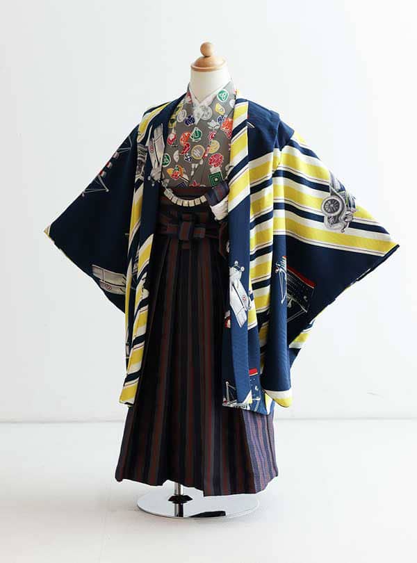 伝統的な和装に現代的なエッセンスを加えた独自性あふれる一枚です。鮮やかなネイビーの羽織には大胆なイエローのラインと車や船などの乗り物が描かれており、目を惹きつけます。新鮮な感覚を与えると同時に和の魅力を感じさせてくれます。 着物にもカラフルな色使いの柄が描かれており、ロマンティックな遊び心満載の個性あふれる印象になります。