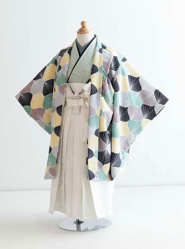 鮮やかな色使いとユニークなデザインが特徴的な一枚です。羽織には幾何学的な模様が優しいトーンのカラーで施され、モダンな雰囲気と伝統的要素が融合しています。袴はシンプルでありながらも高級感が漂い、全面に施された清楚なデザインが羽織のカラフルさと絶妙に調和しています。 全体のコーディネートに一体感を与えつつ、個性を引き立てます。