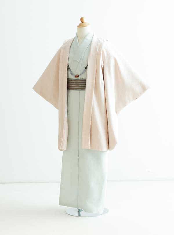 優雅さとシンプルさが融合した現代的な一枚です。淡いグリーンの着物は柔らかな色合いが心を癒し、穏やかな印象を与えます。羽織には柔らかなピンク色が使用されており、着物の色合いと絶妙に調和しています。 シンプルで洗練された帯が全体を引き締め、コーディネートにアクセントを加える役割を果たし、カジュアルながらもエレガントな雰囲気を保っています。