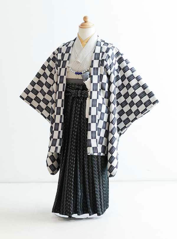 クラシックな美しさとモダンなデザインを組み合わせた一枚です。黒の羽織には日本古来の伝統的な市松模様が施されています。シンプルながらも華やかに見える市松模様は途切れることなく続いていくことから、繁栄や永遠の意味を持つ縁起のいい柄として昔から愛されています。 オーソドックスな印象を持ちながらも着物や袴にも模様が施されており、現代的な要素も持ち合わせています。