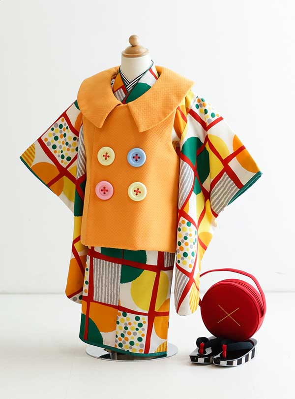 スタジオエミュオリジナルデザインの1着。ポップで可愛いオレンジとグリーンとレッドなどの元気カラーのカラフルな1着です。被布コートは大きな襟とボタンが特徴的で一際目を引きます。 着物の柄も格子柄の中にカラフルな大小のドット柄が描かれポップで可愛いデザインです。セットのバッグもボタンのデザインになっているのもポイントです。個性的な雰囲気が好きな方におすすめ。
