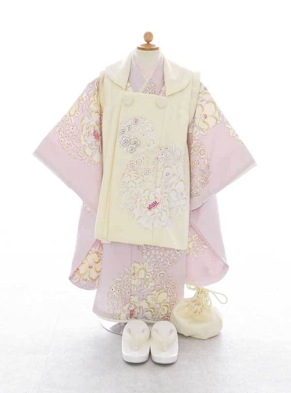 淡いピンクの色味が優しい雰囲気で気品を感じる可愛らしい着物です。着物と被布には、牡丹や梅、藤などの豪華な花々が上品に施されています。 繊細な花柄には、花のような美しさや華やかさを持つ女性に育って欲しいという想いが込められています。パパママも淡いお色味の着物で合わせていただくのがオススメです。