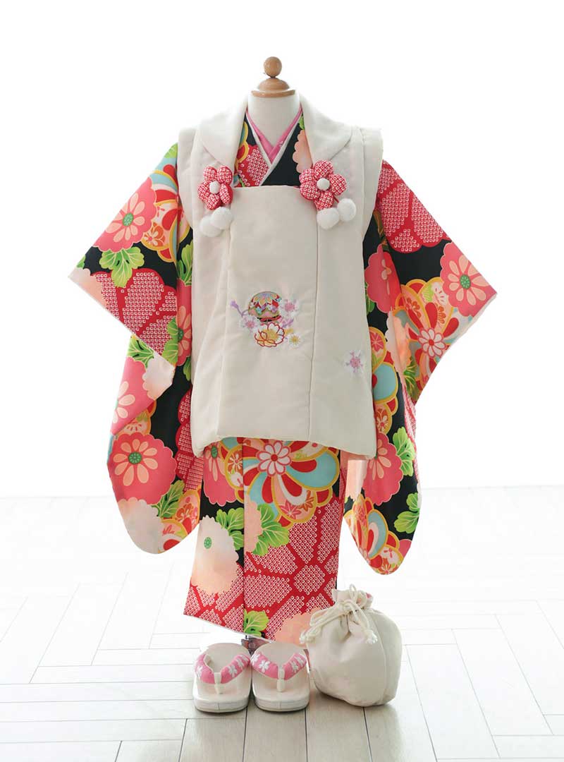 黒地に赤色の花模様が特徴的です。ベースの色味が黒なので花の赤色をパッと際立たせてくれます。大きな花模様がいくつもあしらわれているため、華やかで豪華な雰囲気に仕上げてくれます。 被布コートの白色が全体をしっかりと引き締めとても綺麗に美しくみせてくれます。ボタン部分の立体的なお花のモチーフが可愛らしく子供らしさも感じさせてくれます。