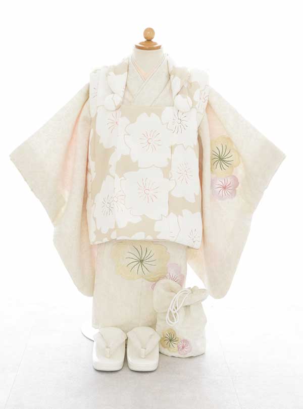 梅の花の刺繡が大きく入っている、淡い色味で優しい雰囲気の着物です。被布はベージュ地で梅の花が一面に描かれており、シンプルな着物を華やかに彩ります。お揃いの柄のバッグもキュート。 小柄なお子様や二歳のお子様にも着ていただけるサイズになります。パパママも淡いお色味の着物で合わせていただくと統一感がでて、オシャレな家族写真が撮れます。