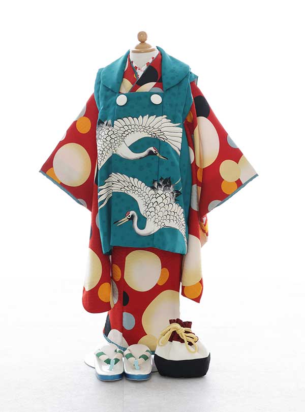 鮮やかな赤色の着物に青緑色の被布コートが目を惹く個性的な1着。着物にはカラフルな水玉模様、被布コートには大きな鶴が2羽大きく描かれており、とても斬新なデザインです。 現代風なデザインながらも和風モダンな雰囲気を感じられる魅力的な着物です。お出かけ時にはブーツを合わせても◎