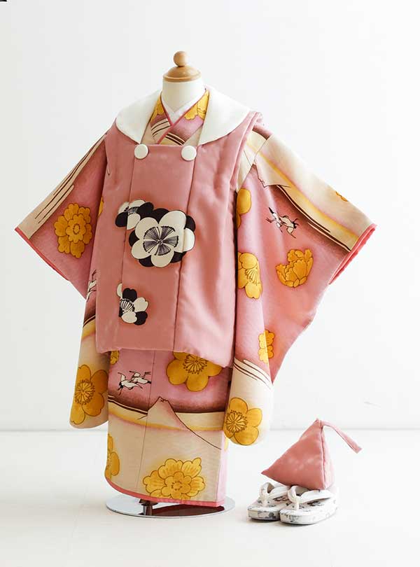 モダンなデザインと伝統的な美しさが融合した一枚です。柔らかなピンク色は女の子らしさを引き立て、花のモチーフが施されたデザインが全体を華やかに彩ります。被布コートの白の襟が清潔感をもたらし、デザイン全体を引き締めます。 独特な色彩と大胆な柄使いは現代的なセンスを感じさせるとともに、お洒落な雰囲気を醸し出します。