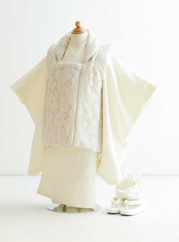 洗練されたデザインと上質な素材が織りなし、エレガントなスタイルを兼ね備えた一枚です。シンプルでありながらも美しい純白の着物は、力強い存在感を放ちながらも優雅で上品な印象を与えます。 ワントーンのデザインがお子様の存在をより一層際立たせます。重厚感のあるレースの刺繍が施された被布コートは着物全体に奥行きを与え、高級感を演出します。