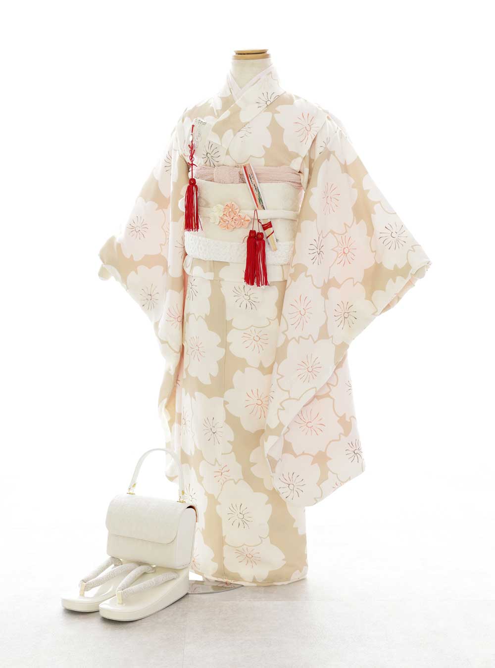 ベージュを基調とした四つ身の衣装は、気品と優雅さを兼ね備えた一着です。柔らかなベージュの生地に、純白の花々が散りばめられたデザインは清楚な美しさを感じさせます。 花模様は大ぶりで大胆に配置されており、自然の力強さと美しさを見事に表現しています。ウエスト部分には、同系色の帯が結ばれており上品なアクセントを加わり美しく引き締めています。