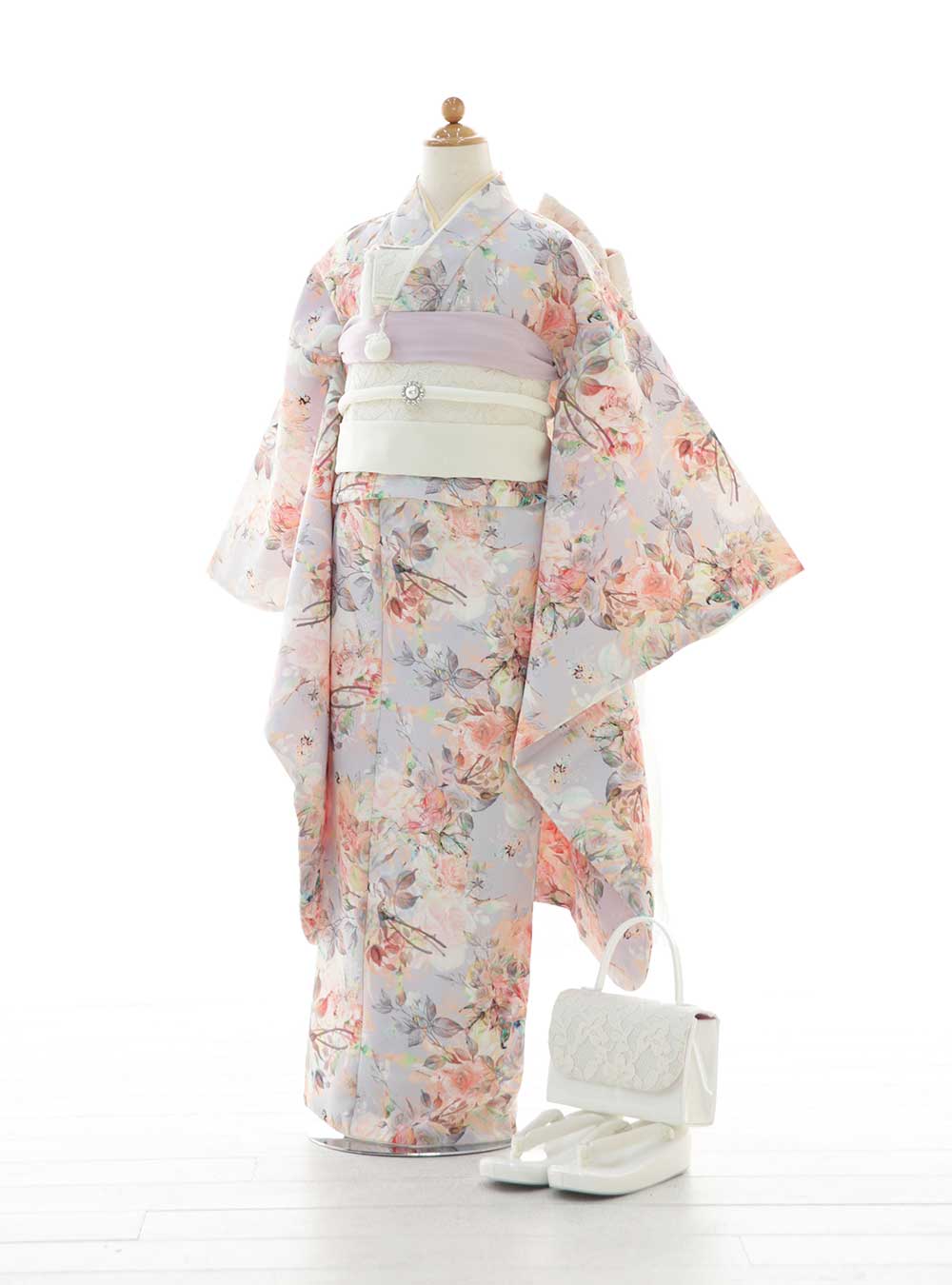 柔らかな淡いピンクを基調とした優雅なデザインが特徴的な一枚です。繊細な花柄が全体に施されており、春の訪れを感じさせるような明るい印象を与えます。花々の色合いはクリーム色や紫、薄い青などが散りばめられ、美しい花畑を纏っているかのようです。 帯はシンプルでありながら上品なデザインが施されており、全体のコーディネートを引き締め、洗練された雰囲気を演出します。