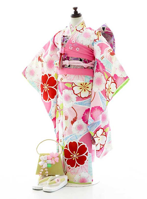 可愛らしいピンクに大胆に描かれた花々が晴れの日を華やかに演出します。目を惹く赤の桜が着物に濃淡をつけ印象に残る1着に仕上げてくれます。 小物にもピンクを使い、可愛らしさであふれる着物です。裾や袖のグリーンの色どりが着物に一味加わりオシャレな印象にしてくれます。