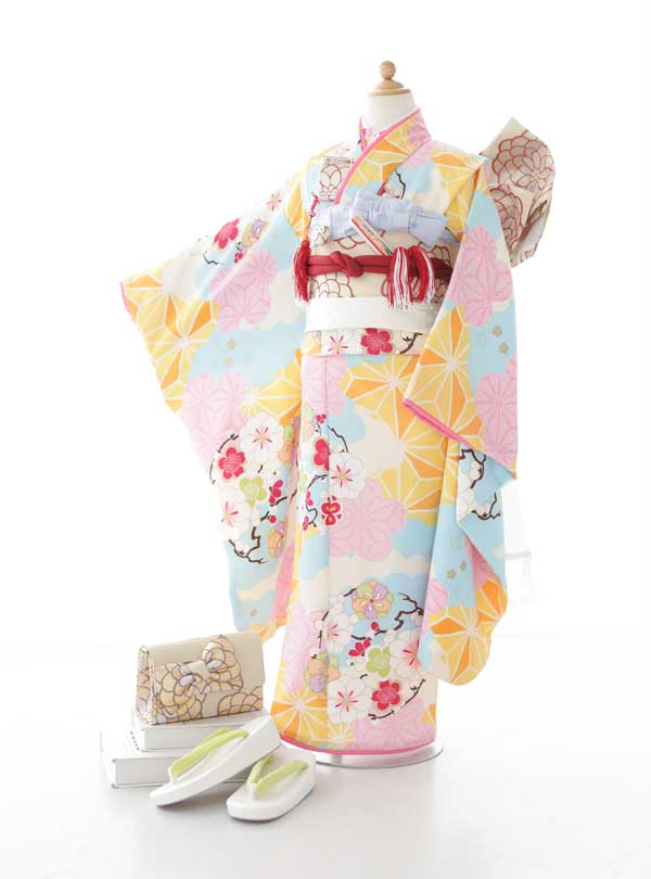 優しい色味が可愛らしい人気の1着。淡い水色とピンクで雲取り柄が施され、黄色の麻の葉文様がポイントになったモダンなデザイン。雪輪のように丸く描かれた梅の花がとても可愛らしく華やかな印象です。 淡い色味がお子様にもとても人気で撮影はもちろん秋のおでかけレンタルでも選ばれます。セットのバッグの大きなリボンも人気のポイントです。