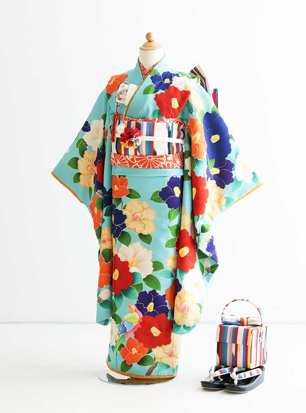 鮮やかな色彩と大胆なデザインが魅力的な一枚です。爽やかなミントグリーンを基調とした地に大きな花柄が大胆に描かれています。赤、青、黄色などのカラフルな花々が全体に散りばめられ、目を引きつけます。帯はストライプ柄が特徴的で全体のコーディネートにモダンなアクセントを加えています。 帯の鮮やかな色合いが着物のデザインと見事に調和し、全体に統一感と活気をもたらしています。