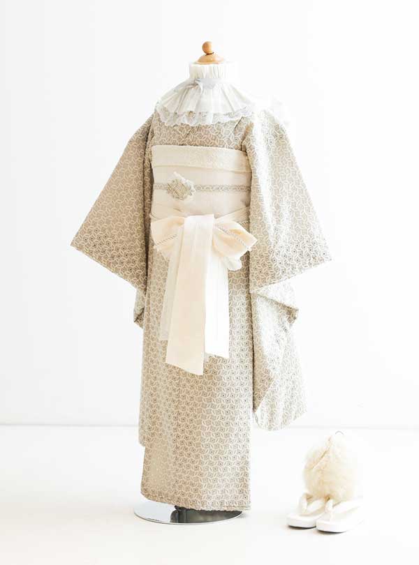 ちょっと背伸びした大人っぽさのある総レース仕上げのベージュの着物です。小物はアイボリー色でまとめられており、前でリボンに結ぶことで大人っぽさの中にも可愛らしい印象を与えます。 帯締めやバッグにほどこされたビジューやスパンコールがキラキラ輝き、シンプルな装いの中にも華やかさを演出してくれます。襟元のレースが個性的なデザインで、オシャレが好きなお子様にピッタリの着物です。