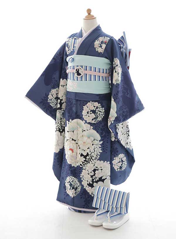 深い青色を基調にした華やかなデザインが魅力的な一枚です。青は高貴さや落ち着きを象徴し、全体に施された大きな花柄が優雅さと存在感を引き立てています。裾の白色の花々が映えており、まるで夜空に咲く花のような美しさを感じさせます。 帯には明るいストライプ柄が施され、全体のスタイルにアクセントを加えると同時に洗練された印象を与えます。