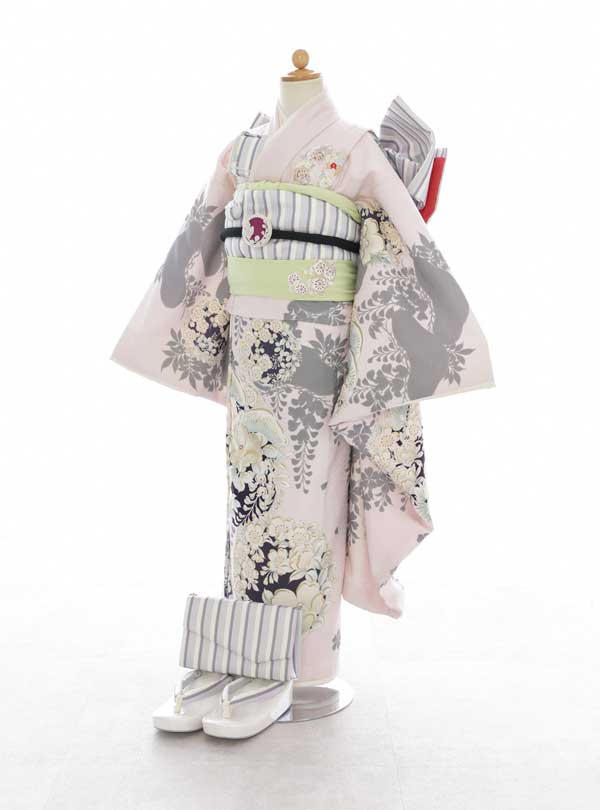 上品な雰囲気を醸し出す淡いピンクとグレーのカラーをベースに、優美な花々が描かれている着物です。ピンクの生地は可愛らしさを演出し、グレーの大胆な模様が加わることで、より一層深みとスタイリッシュな印象を与えています。 優しく落ち着いた雰囲気で大人っぽい印象を与えつつ、ストライプの帯やグリーンの小物が可愛らしさをより一層引き立てます。