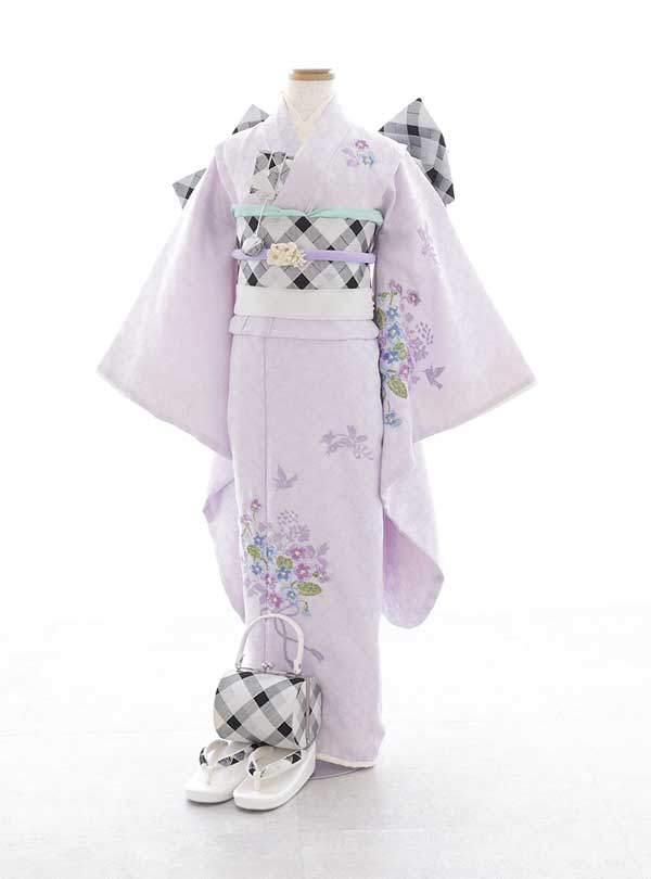 中央には可愛らしいスミレのブーケの模様が描かれており、愛らしいラベンダーの色が優しく女性らしい印象を与える着物です。帯の白黒のギンガムチェックがアクセントになっていて、大人っぽい可愛さの中にも子供らしい可愛さも忘れません。 ふわふわとした優しい雰囲気が幸せな気持ちにしてくれる着物です。紫が好きなお子様におススメの着物です。