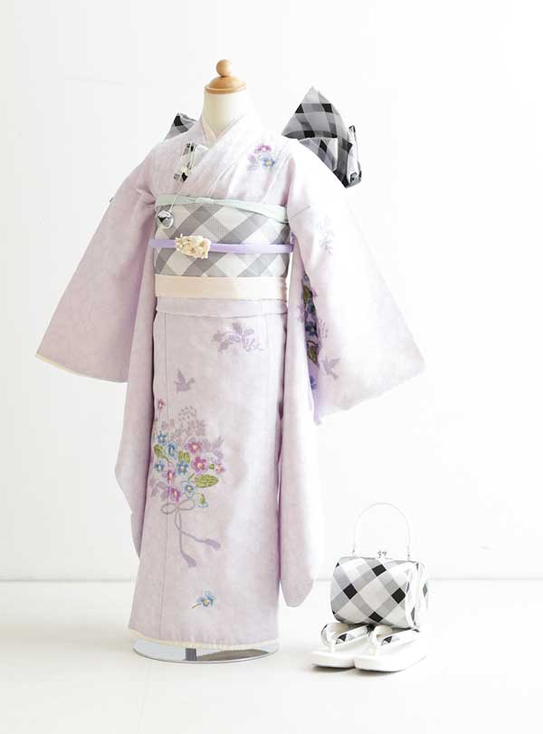 中央には可愛らしいスミレのブーケの模様が描かれており、愛らしいラベンダーの色が優しく女性らしい印象を与える着物です。帯の白黒のギンガムチェックがアクセントになっていて、大人っぽい可愛さの中にも子供らしい可愛さも忘れません。 ふわふわとした優しい雰囲気が幸せな気持ちにしてくれる着物です。紫が好きなお子様におススメの着物です。
