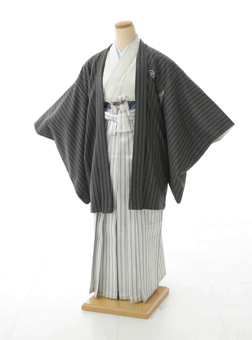 グレーシルバーの縞模様が特徴的なデザインです。羽織は上品なグレーの地にシルバーのストライプが入り、シンプルながらも洗練された印象を与えます。内側には白い着物とストライプの袴が合わせられ、清潔感とともに格式高い雰囲気を演出しています。 特別な儀式や祝賀の場にふさわしい、スタイリッシュで伝統的な装いです。