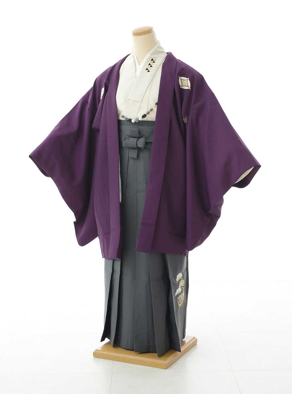 伝統的な美しさと洗練されたデザインが絶妙に融合した一枚です。羽織は深みのあるパープル色でシンプルながらも優雅なシルエットが特徴です。羽織の襟元には施された細かいデザインがさりげなく個性的な魅力を引き立てています。 袴は落ち着いたグレーで全体の印象を軽やかに引き締めます。羽織の深いパープルが見事に調和し、クラシックでありながらもモダンな装いを実現しています。