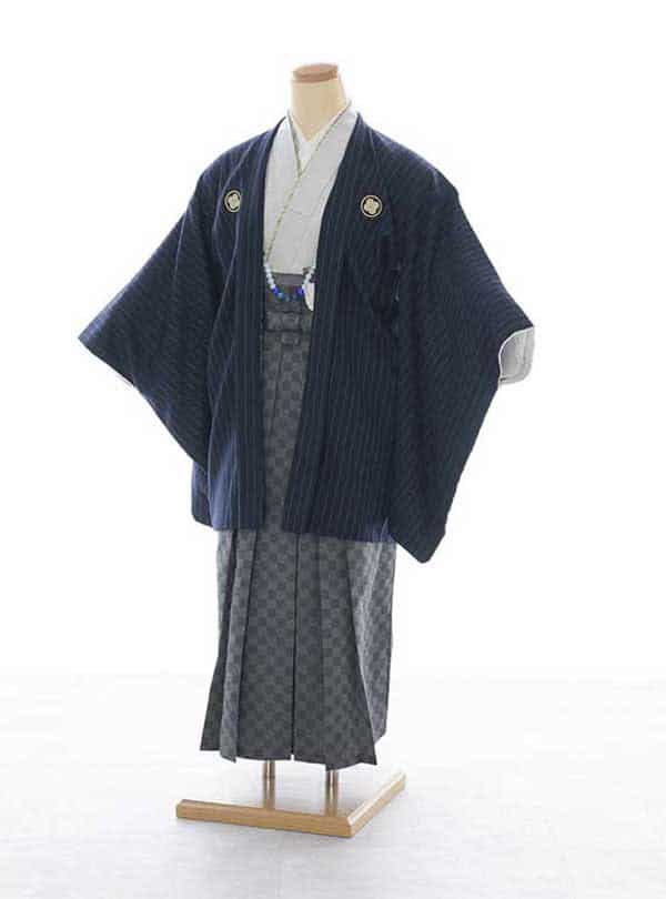伝統的な日本の美と洗練されたデザインが見事に融合した一枚です。羽織は深いネイビーブルーにストライプ模様が施されており、シンプルながらも力強い印象を与えます。 袴は細かな格子模様のグレーで仕立てられており、全体に洗練された印象を与え、羽織のダークな色合いとの対比を生み出します。動きに合わせて美しく揺れる裾が印象的です。