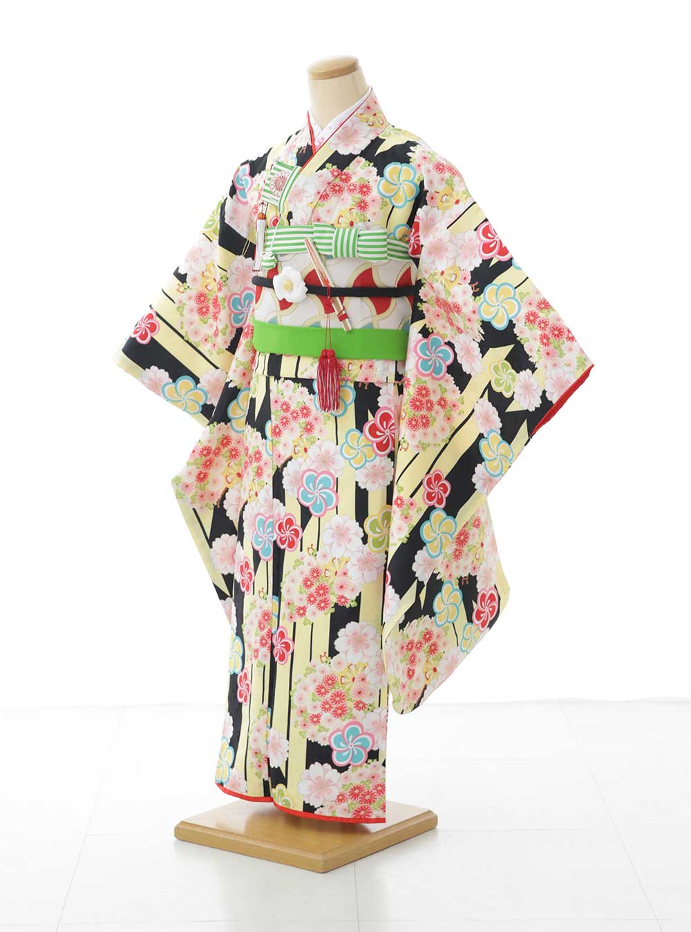 黒と黄色の縦縞を基調としたデザインで、その上に色とりどりの花が散りばめられています。縦縞は伝統的な和装に見られる柄で、黒と黄色のコントラストが全体を引き締めています。 花の中には抽象的なデザインのものもあり、伝統と現代的な雰囲気が融合した印象を与えます。こちらの衣装は、上品でありながらも明るく活気のある1着です。