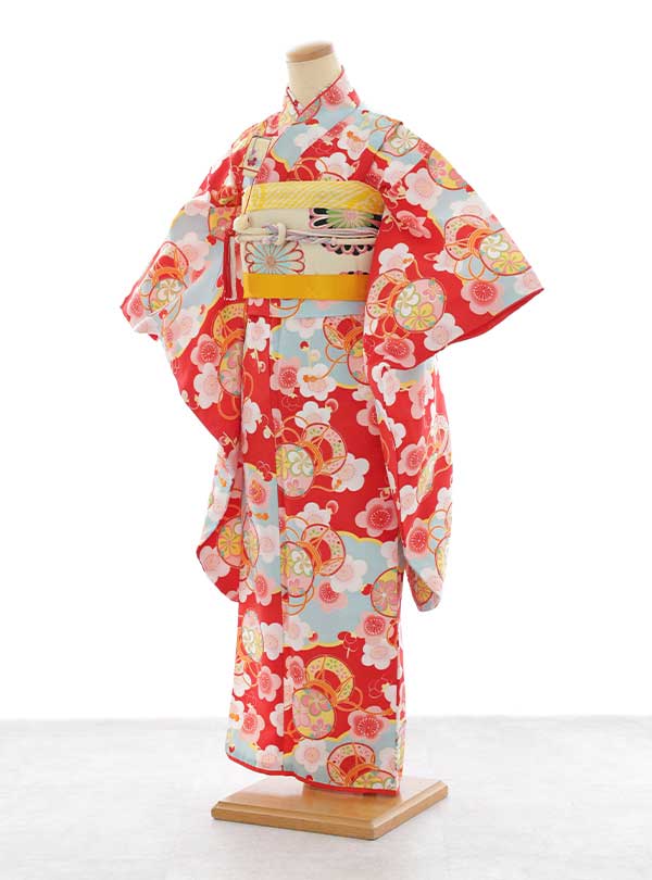 鮮やかな赤を基調に水色やピンク、白色の花柄が全体に施されており、とても華やかな印象を与えます。特に梅や毬など伝統的な花模様や小物の模様が際立ち、豪華さと上品さを兼ね備えています。 伝統的な和装要素をしっかりと守りつつ、モダンな要素も取り入れた華やかな着物です。