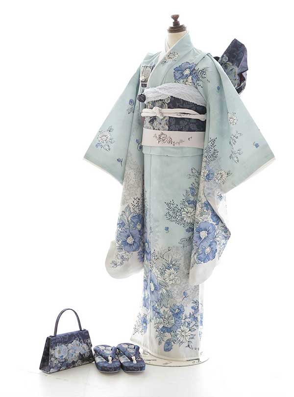 鮮やかな水色と青やグレーで統一されたシックな着物です。人気ブランドJILLSTUARTのデザイン。青を基調とした花々が上前や袖にあしらわれとても上品なデザインです。 デニム調の帯を締めることで全体が引き締まり大人っぽい雰囲気になっています。全体が青とグレーで統一されているので落ち着いた色味でシックな印象です。