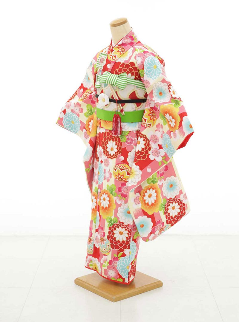 華やかなデザインが特徴的な着物。明るいピンクを基調に赤色・水色・オレンジなどの花柄が全体にあしらわれており、春のような華やかさを感じさせます。大きな花柄が目を引き、若々しく元気な印象を与えます。 大人になる一歩手前に子供らしさが引き出せる可愛らしいカラーリングとデザインが好評で、ご家族にも人気です。