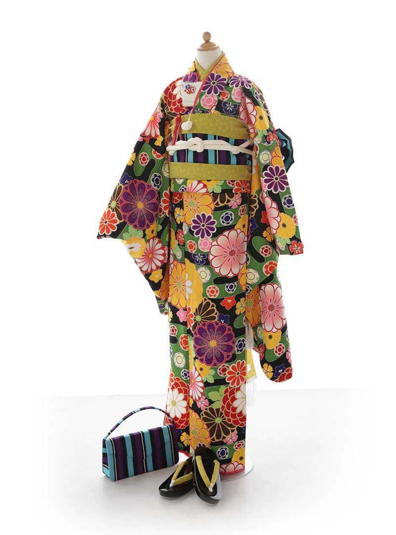 黒地にカラフルな花柄が大胆に描かれたデザインです。ピンク、紫、黄色、オレンジの花々が華やかさを引き立て、視線を集めます。帯は落ち着いた緑色で、白の帯締めがアクセントとなり、全体にバランスを持たせています。 バッグと草履はストライプ柄でモダンな印象を加え、伝統と現代の要素が融合した個性的な一着です。鮮やかな色合いとデザインが魅力的です。